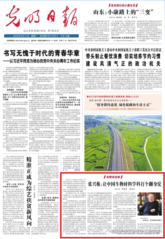 编者按:8月17日,光明日报头版以《张兴栋:让中国生物材料学科打个翻身仗》为题,报道了光明日报记者对张兴栋院士的专访内容。全文如下: