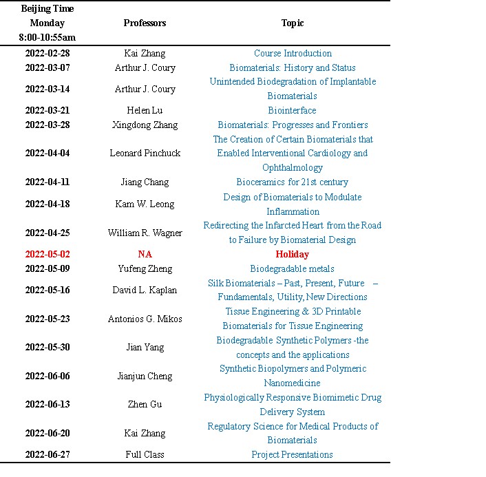 一、团队力量强。本学期授课教授由15位国际名师组成,包括James M. Anderson,Arthur J. Coury,David L. Kaplan, Kam W. Leong, Antonios G. Mikos, Leonard Pinchuk 及张兴栋等7位美国国家工程院院士和常江,程建军,顾臻,Helen H. Lu,William R. Wagner,Jian Yang,张凯,郑玉峰等8位美国医学与生物工程院Fellow。其中绝大多数名师是生物材料领域中一流学术期刊的主编或副主编。