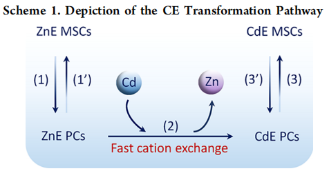 该研究基于余睽教授团队提出的原创性理论模型“余氏双路径模型”(Nat. Commun. 2017, 8, 15467;J. Phys. Chem. Lett. 2019, 10, 6399−6408)和“余氏二步合成法”(Chem. Mater. 2017, 29, 5727−5735),该研究提出ZnE MSCs(Magic-Size Clusters,幻数团簇)先异构化为ZnE PCs(Precursor Compounds,前驱化合物),再与Cd(OA)2经室温下阳离子交换反应而生成CdE PCs,进而再异构化生成CdE MSCs的三步骤的纳米合成化学反应。ZnE MSC到CdE MSC的室温阳离子交换,进一步支持了“余氏双路径模型”,支撑了团队近期提出的MSCs中存在PCs且MSCs和PCs可发生异构化反应而相互转化的新概念,揭示了ME PC/MSC(M = Zn, Cd)中阴离子E数量守恒和架构守恒,阐明了MS PC/MSC具有相似的化学计量,MSe PC/MSC (M = Zn, Cd) 也具有相似的化学计量,为科研人员深入理解直接合成PC/MSC及量子点的反应机理提供了关键性证据:是阴离子E反应物/前驱化合物,而不是阳离子M反应物/前驱化合物,定量地主导着ME QD诱导期中PC“先发生自组装反应,再生成M-E共价键”的反应过程。