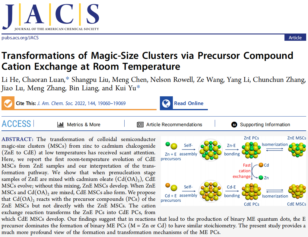 近日,国家生物医学材料工程技术研究中心/原子与分子物理所余睽教授团队长达五年的关于二元ZnE幻数团簇到CdE幻数团簇的室温阳离子交换的研究工作,在化学领域权威期刊J. Am. Chem. Soc杂志得到发表,题目为“Transformations of Magic-Size Clusters via Precursor Compound Cation Exchange at Room Temperature”。论文第一作者为国家生物医学材料工程技术研究中心博士生何丽,余睽教授和栾超然博士为论文共同通讯作者。suncitygroup太阳集团系论文第一完成单位。