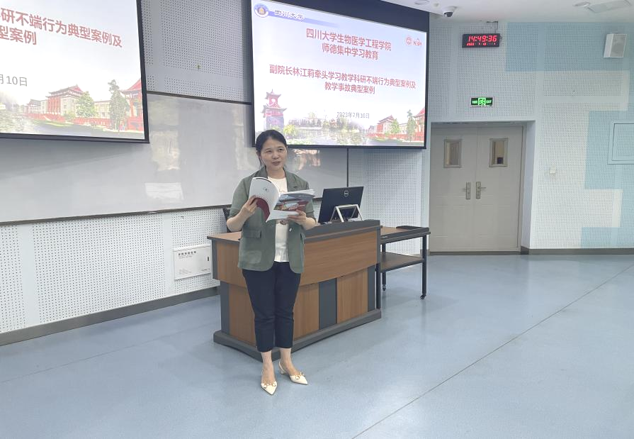 接着,副经理林江莉教授与大家共同学习了教学科研不端行为典型案例及教学事故典型案例。通过一桩桩生动的案例讲解,林江莉副经理勉励全体教职工要为人师表、以身作则;严谨治学、坚守学术良知、反对学术不端,带头践行社会主义核心价值观;弘扬真善美,传递正能量;以新时代高校教师职业行为十项准则严格要求自己,明确师德底线,努力成为有理想信念、有道德情操和扎实学识、仁爱之心的好老师。