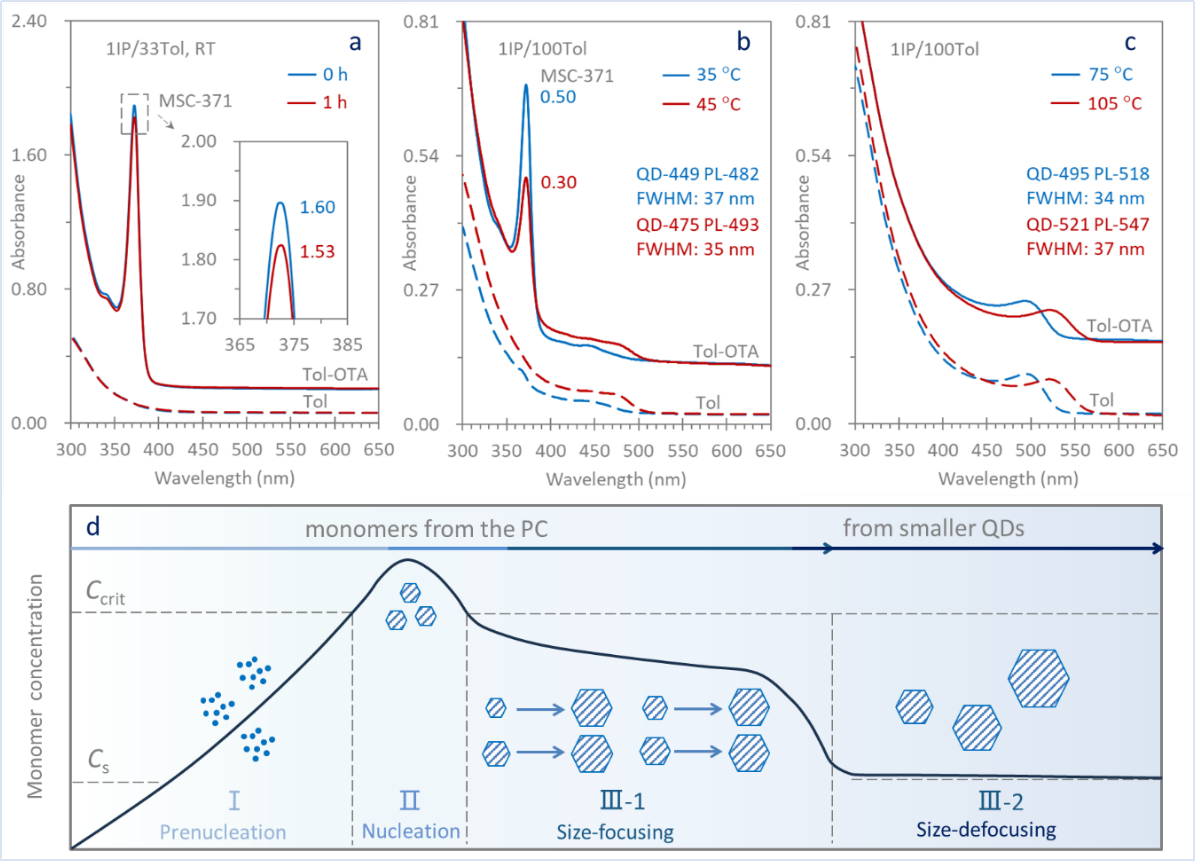 高温成键/低温成核生长的二步合成法制备小尺寸CdTe 量子点(QDs)。(a)CdTe诱导期样品中的预成核团簇在甲苯(Tol)溶剂中分解生成单体,该阶段没有QD出现;(b)单体浓度过饱和,QD成核生长,尺寸分布变窄;(c)PCs完全消耗,QD的生长遵循奥斯瓦尔德熟化机制,尺寸分布变宽。(d)遵循经典LaMer成核生长理论模型的单体到量子点过程。