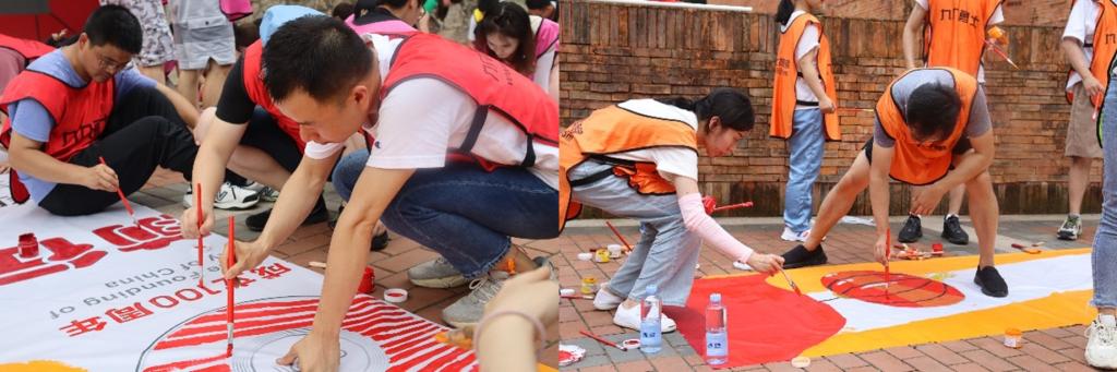 竞技类游戏结束,最后是最温馨的全场大合作环节——“共绘蓝图”。面对一幅等待上色的巨画,在场所有师生热情饱满,跃跃欲试。在温柔的背景音乐下,大家按照分工,齐心协力,将一抹抹的鲜艳色彩涂满整副巨画。在橘红色晚霞和山间阵阵凉风陪伴下,绚丽的色彩渐渐铺满了画卷。在张兴栋院士的带领下,课题组全体师生在巨大的画布前合影留念。