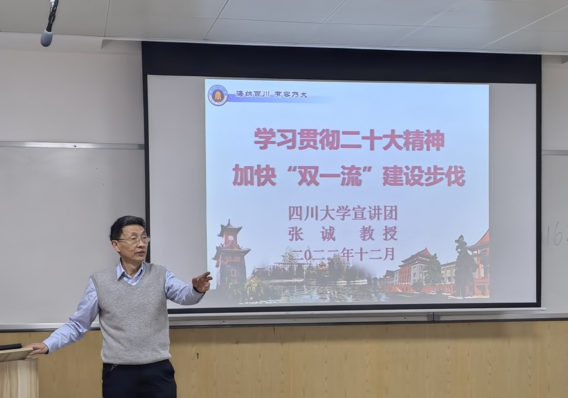 张诚以“学习贯彻二十大精神,加快‘双一流’建设步伐”为题,着重从“二十大划时代里程碑意义、二十大报告的鲜明主题、过去五年和新时代十年伟大变革及‘两个确立’的重大意义、习近平新时代中国特色社会主义思想的主要内容及其世界观和方法论、以中国式现代化推进中华民族伟大复兴的使命任务和重大战略部署、以伟大自我革命引领伟大社会革命的重要要求、以团结奋斗应对风险挑战的时代要求”等七个方面,深入浅出地宣讲了二十大的主要精神。