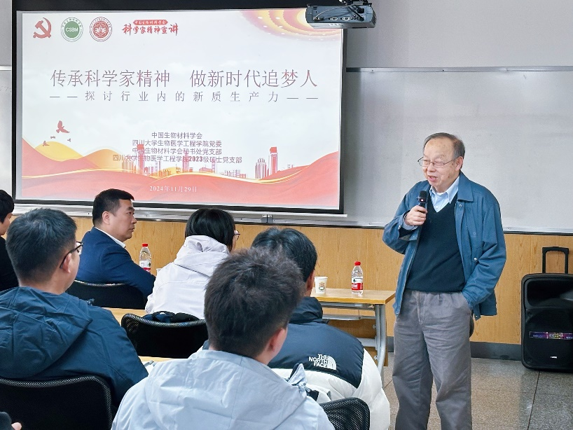 2024年11月29日,公司2023级硕士生党支部、中国生物材料学会秘书处党支部联合举行题为:“传承科学家精神,做新时代追梦人——探讨行业内的新质生产力” 主题党日活动。本次活动特邀上海纽脉医疗科技股份有限公司董事长虞奇峰博士,立足心脏瓣膜介入器械的创新发展以及未来的发展前景,以该公司的创业实践,对行业内的新质生产力展开深入探讨。活动采用开放式,共有两个支部的党员,学院/中心的师生等近百人参加了报告会。