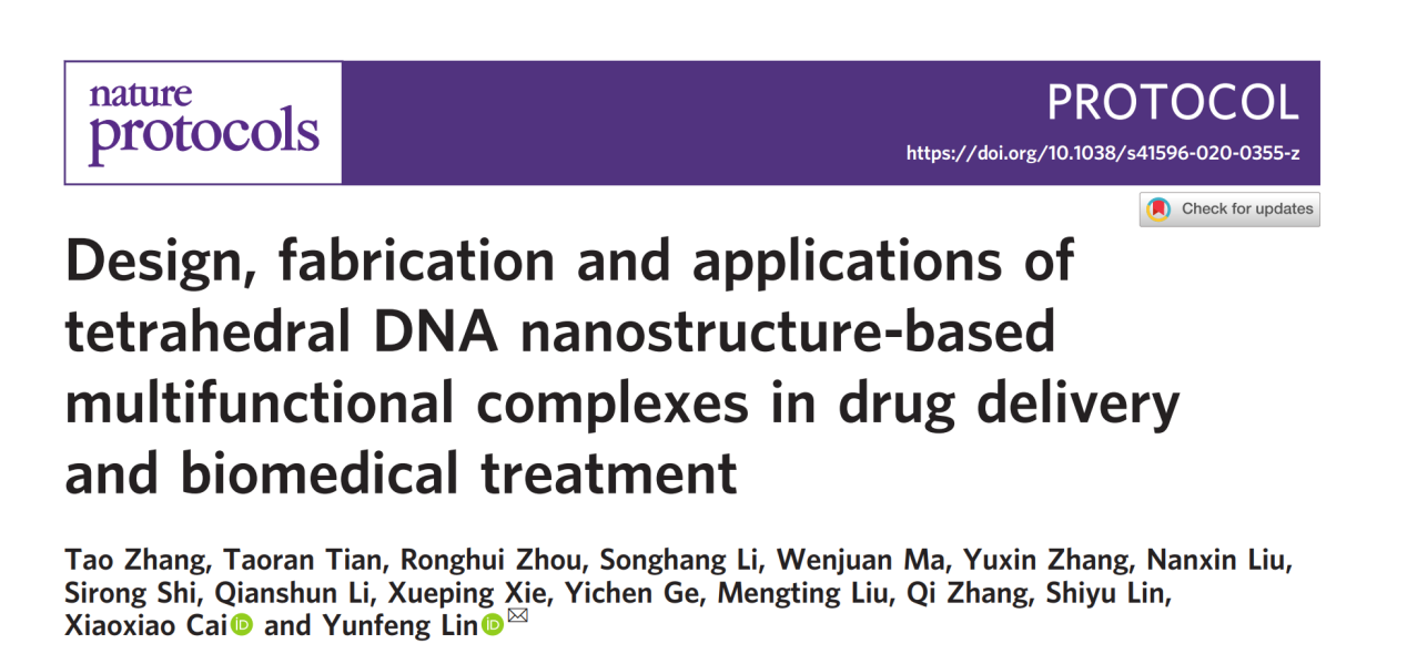 近日,公司华西口腔医学院、suncitygroup太阳集团的林云锋教授团队,在国际前沿期刊《Nature Protocols》上发表了题为“Design, fabrication and applications of tetrahedral DNA nanostructure-based multifunctional complexes in drug delivery and biomedical treatment”的论文。suncitygroup太阳集团为该论文的唯一单位,张陶博士后为该论文的第一作者,林云锋教授为唯一通讯作者。